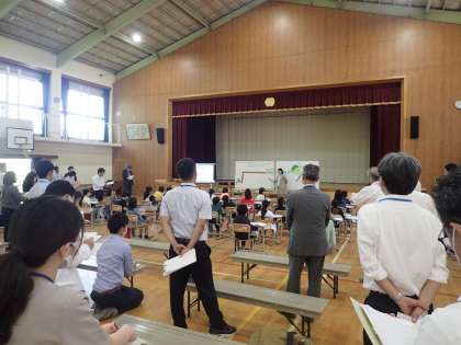 この研修会は今年度9回予定されており、小栗栖中学校区(小栗栖中学校・石田小学校・小栗栖宮山小学校)の教職員が一堂に集まり、児童・生徒に育成すべき資質・能力や授業改善等について、公開授業を通して研究を深めていきます。