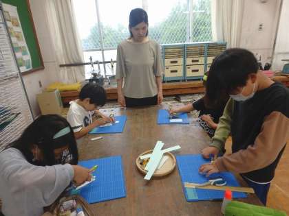 「コロコロガーレ」の学習がスタートしました。教室の前に置かれた見本で遊びながら、この学習をとっても楽しみにしていた子どもたち!まずは、コースの作り方を知りました。