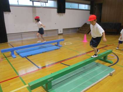 体育館でゆうぐあそびをしました。平均台を使って遊びました。