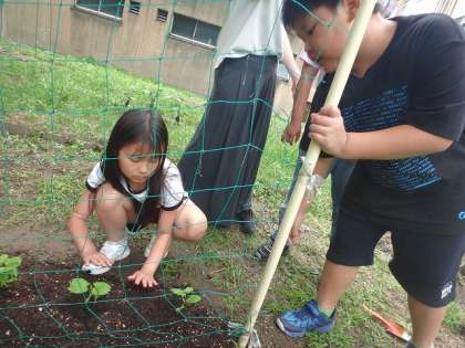 教室でお世話をしていたツルレイシを畑へ!協力してくれたみんな、ありがとう!!!
