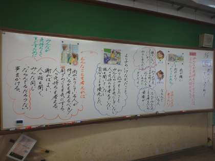 「雨のバスていりゅう所で」のお話を読み、よし子さんのいけなかったところはどこなのか…バスを待つ人たちはどんな気持ちだったのかを考えることを通して「みんなが気持ちよく過ごすために大切なこと」について考えました。