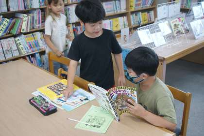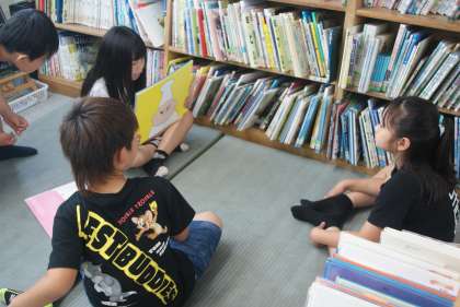 図書館に行きました。最近は紙芝居の読み聞かせをしています。本が好きな子どもたちです。