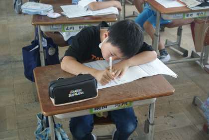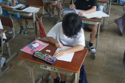 国語では、手紙を書く学習をしています。3年1組で行うお誕生日会に先生方を招待するお手紙です。気持ちが伝わるように一生懸命書いています。