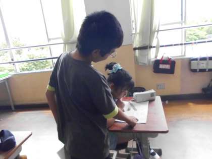算数では、「小数のわり算」の学習を進めています。みんなで理解していけるようにと、教え合いをする姿が素敵です。