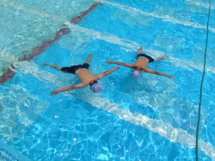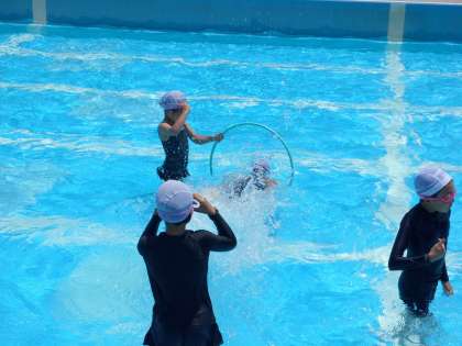 浮いたりもぐったりする水遊びに取り組みました。鼻から息が出せているのか、力を抜いて浮けているかを確かめながら学習を進めました。