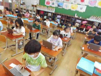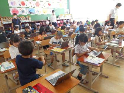 観察記録文に載せるため、あさがおの写真をGIGA端末で撮りました。提出の仕方などを支援の先生に教えてもらいながら、全員が写真を提出することができました。