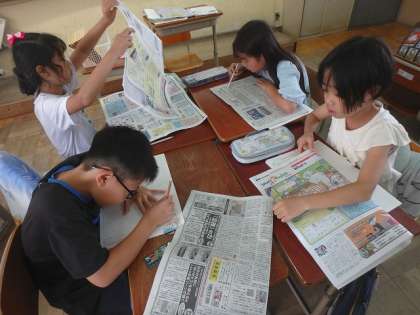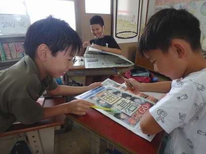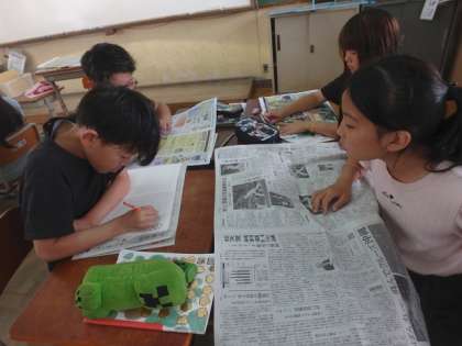 この学習では、新聞を作ります。学習の初めとなるこの時間には、実際に新聞を手に取り、どのようなことが書かれているのかやレイアウトについて話し合いました。