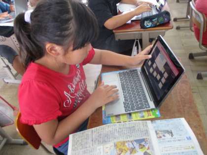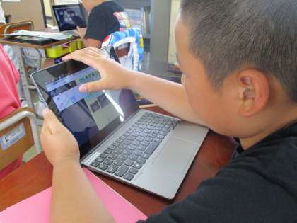 ロイロノートを活用して新聞を作っています。レイアウトを考えながら、一生懸命取り組む子どもたちでした。