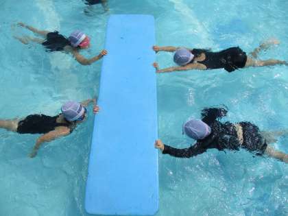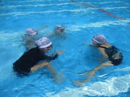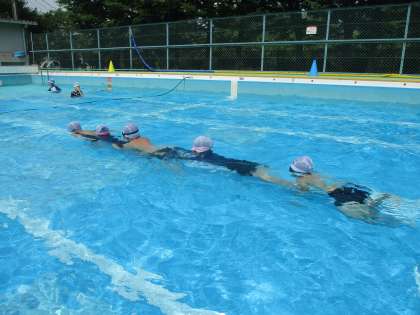 水あそびでは、水中おしずもうや、電車ごっこ、みんなでもぐりっこなどグループで工夫して楽しく遊んでいます。