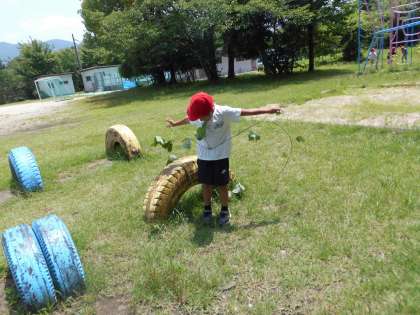 「先生、見て。バッタを捕まえた。」と嬉しそうに虫かごを見せに来てくれたり、「こんな長い弦があった。」と自分の体に巻き付けて遊んだり、夏の様子を楽しんでいました。