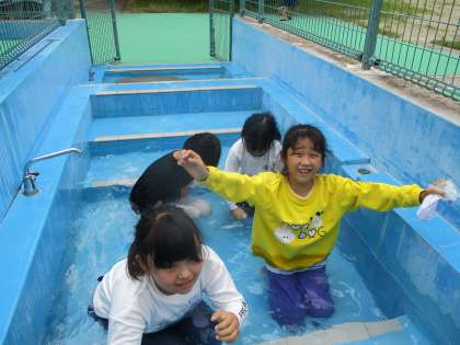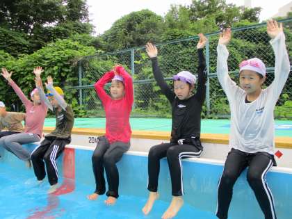 着衣泳の学習を行いました。まずは、服を着たまま水の中に入り、動きにくさを実感しました。