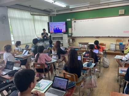 始めにALTのチャン先生から、今のユニットで学習した言い方や単語についてのクイズをカフートというアプリで楽しみました。その後、友達と見たいスポーツを尋ね合いました。