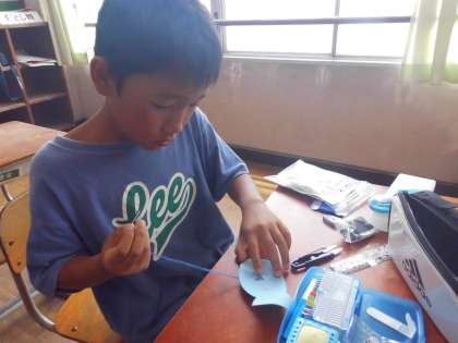 家庭科では、魚の形をしたマスコット作りに挑戦しています。自分の名前を縫ったり、ボタンをつけて目にしたりと、今まで学習したことを生かしながら取り組んでいます。