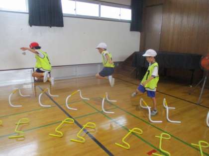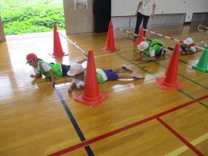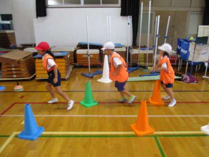 ランランランドでは、グループでいろいろな動きを考えながらリーダーのまねっこをして動いています。