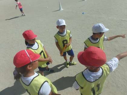 バトンパスの工夫をしっかりとチームで話し合うことができています。「タイミング」