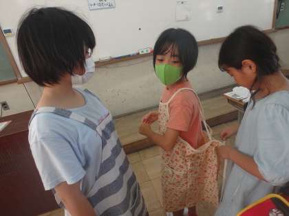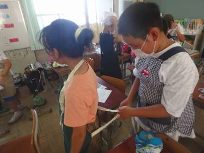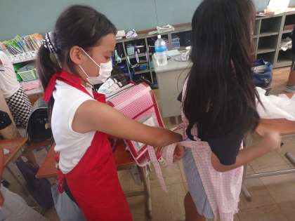 調理実習をしました。男女関わらず、エプロンのひもを結び合う姿がほほえましかったです♪