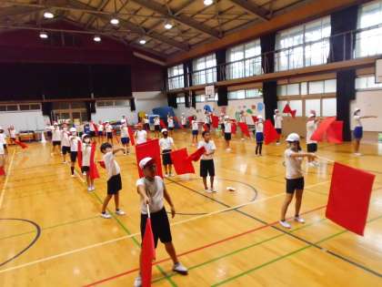 運動会で取り組む「フラッグ」の練習をしました。まずは、いろんな種類の旗の振り方をやってみました。音が「バサッ」と揃うと気持ちがいいです。