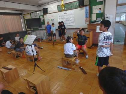 グループで話し合った演奏の工夫をクラスのみんなに伝え、演奏の発表会をしました。間奏を話す時には、「スタッカート上手に演奏できてた!はずんでるような感じがした!」と、初めに曲を聴いた時に感じ取ったことに立ち戻りながら、感想を話していました。