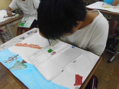 図工では、お話の絵に取り組んでいます。下書きが終わり、絵の具にはいりました。