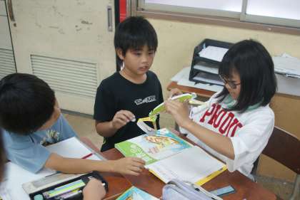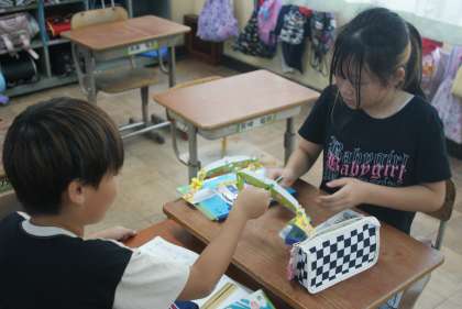 手作りの天秤を使って、文房具の重さを量りました。天秤の片方に量る文房具を、片方に一円玉を置いていき、何枚でつり合うのかを調べました。楽しく重さの学習をすることが出来ました。