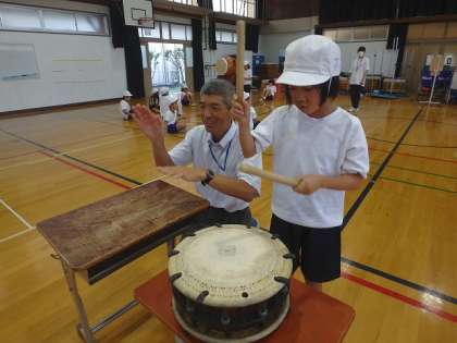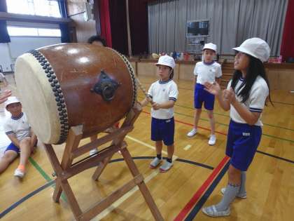 太鼓のリズムを確かめました。締め太鼓のリズムを聴きながら…友達とリズムを合わせるのは難しいですね。がんばろう!!!