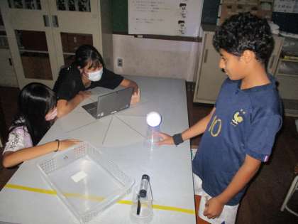 ライトの明かりを太陽に真ん中に置いたタブレットを地球に、白いボールを月に見立てて、それぞれの位置によって太陽の光を反射させて月がどのように見えるのかを調べました。