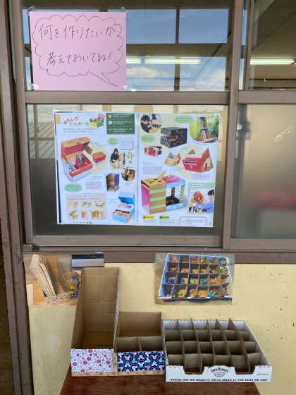 次の学習で取り組む作品の見本を掲示しています。「何を入れよう?」とわくわくした目で作品を眺めている子どもたちでした。