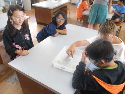 子どもたちからは、「蒸発させてみたい。」「冷やしてみる。」などの声がたくさん上がり、5年生で学習した「もののとけ方」でやったことがあると思い出していました。また、教科書を見て予習をしてきたという子もいて、「リトマス紙っていう紙を使ってみたら分かるみたいやで。」という声もありました。