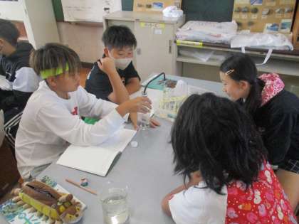 炭酸水から出ている泡が溶けているものの正体ではないかということで、炭酸水の入った試験管をふったり、お湯につけたり、石灰水に通したりして考えていきました。
