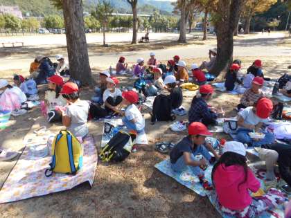 小栗栖宮山小学校のお友達と、お弁当の中身を見せ合いながらお弁当タイムを楽しんでいました。