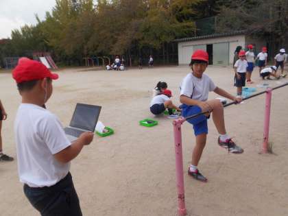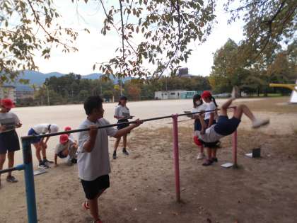 体育では、鉄棒運動の学習に入りました。まずは、自分ができる技とできない技を2人組になって確かめました。友達と「こうやるんやで!」と教え合いながら進めている姿が素敵です。