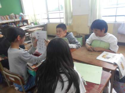 外国語では、友達に「できること・できないこと」をインタビューし、「この人は誰でしょうクイズ」を作って、班で問題を出し合いました。「He can 〜.」「She can't 〜.」などの表現を上手に使って、問題を出し合うことができました。