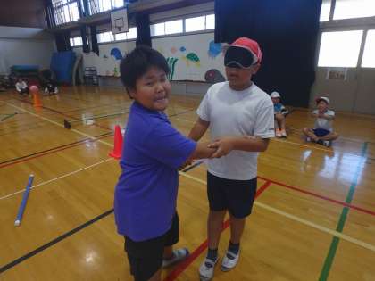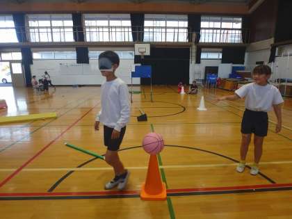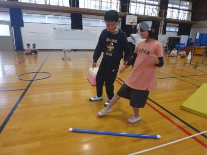 アイマスク体験をしました。アイマスクをした人をボールの位置まで案内しました。