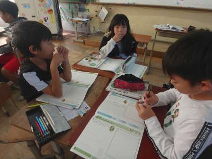 「交かんメール」の話を読み、学級や学校のよさについて話し合いました。道徳ノートに書くところがなくなるくらい、よさを出し合っていた子どもたち。出てきた意見はまとめて教室の前に掲示することになりました!