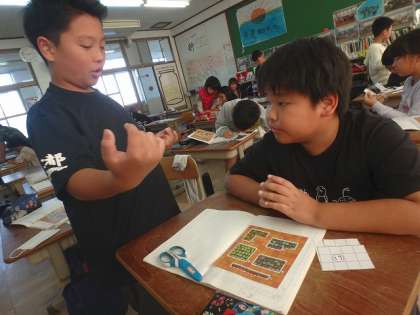 異なる広さの花壇をどのようにして比べればよいのかについて話し合いました。「考えを発表したい!」という子どもたちの意欲がすてきです。