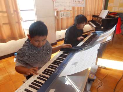 音楽では、「キリマンジャロ」の合奏をしています。今までは、リコーダーと鍵盤ハーモニカだけで演奏をしていましたが、オルガンや打楽器などをいれました。みんなで揃えるとどうなるか楽しみです。