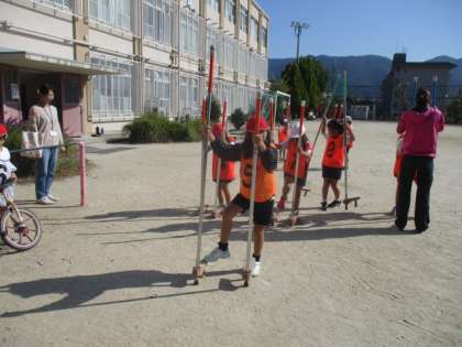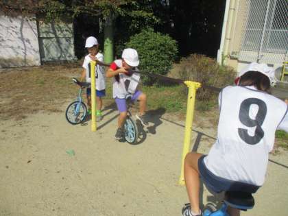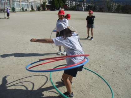 2回目のゆうぐあそびでは、竹馬や一輪車をつかって遊びました。フラフープでは、他にどのようなあそびができるか工夫してあそびました。