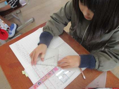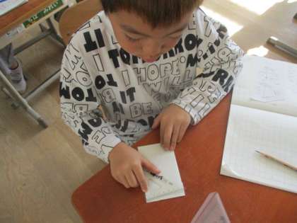 長方形の学習をしました。紙を折って作った四角形の角や辺の長さについて調べました。