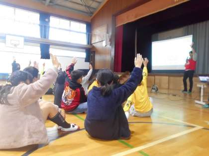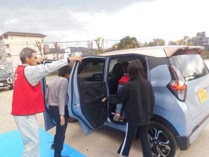 環境学習では、三菱自動車の方をゲストティーチャーとしてお招きして、電気自動車のことや車のリサイクルのお話などを聞きました。実際に、ガソリンで走る車と電気自動車の乗り比べもさせてもらい、電気自動車の乗り心地に感動していました。