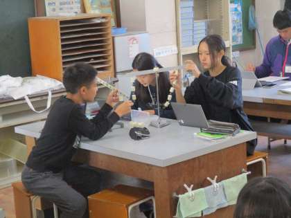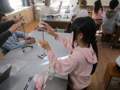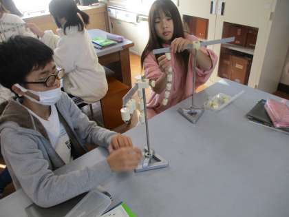 実験用てこを使って、おもりの位置や数によってどのように傾くかについて考えていきました。