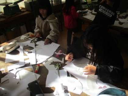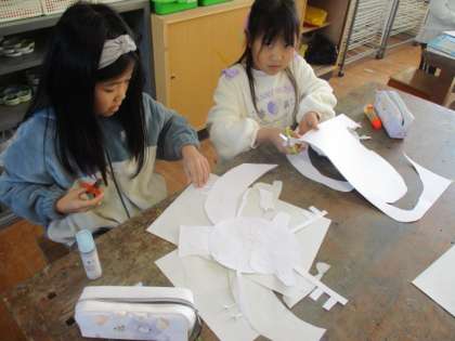 紙版画の学習で、龍を作っています。かっこいい龍やかわいい龍など、顔を工夫して作っています。