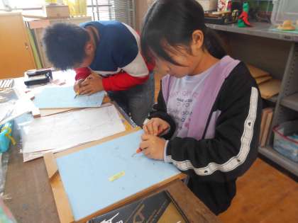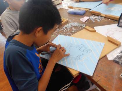 図工では、掘り進み版画に挑戦!1年ぶりの彫刻刀でしたが、とても上手に使えていて驚きました。
