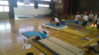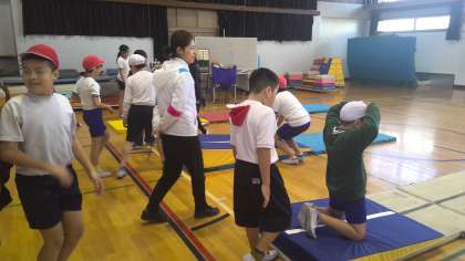 体育の学習でマット運動を行っています。あと少しでできそうな技に色々な場でチャレンジしています。バディ同士でアドバイスをする姿も素敵です!