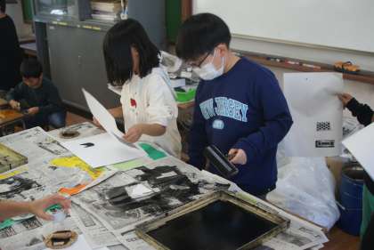 図工では紙版画に取り組んでいます。まずは、紙や段ボールがどのように写るのかを試しにやってみました。どのような作品にしようかイメージすることができました。