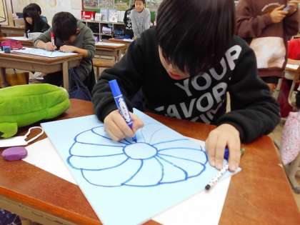 この時間は、アイデアスケッチした花を版にかきました。
