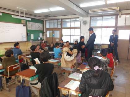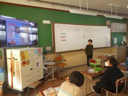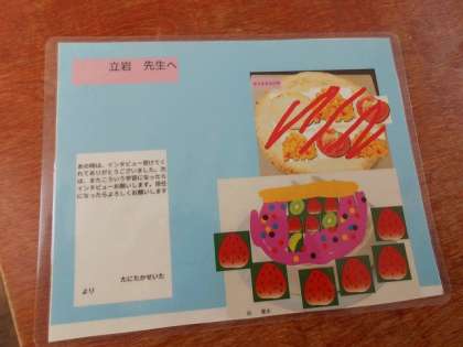先生にプレゼントするピザやケーキのカードが完成しました。できたカードを友達に紹介する活動をしていると…なんと教室に校長先生が!「いいタイミングだ!」と実際にプレゼントしました。みんながにこにことし、とってもすてきな時間でした。