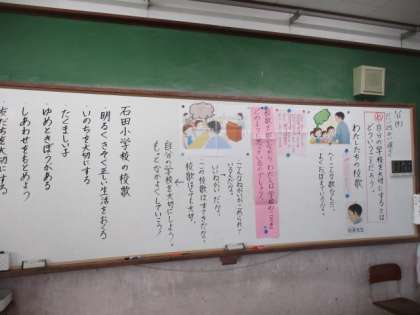 わたしたちの校歌というお話を通して、自分の学校を大切にすることについて考えました。授業の後半では、石田小学校の校歌にこめらた意味について考え、石田小学校をよりよくすることについて考えました。