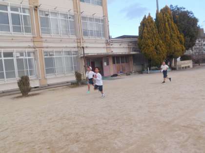 体育では、3分ジョギング→心拍数計測→3分ジョギング→心拍数計測の流れで、計6分同じペースで走ることを目標に頑張っています。まだペースをつかめていない子が多いですが、徐々に自分のペースを見つけていってほしいと思います。