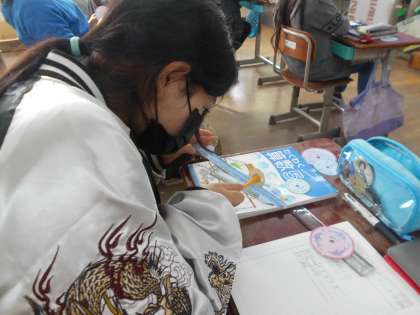 いろんな大きさの円の円周をはかり、円周÷直径をして円周率を求めました。どの大きさの円も大体3.14であることが分かりました。