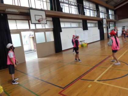 体育では、バスケットボールの学習が始まりました。まずは、自分のチームでパスをし合って、ウォーミングアップをしました。